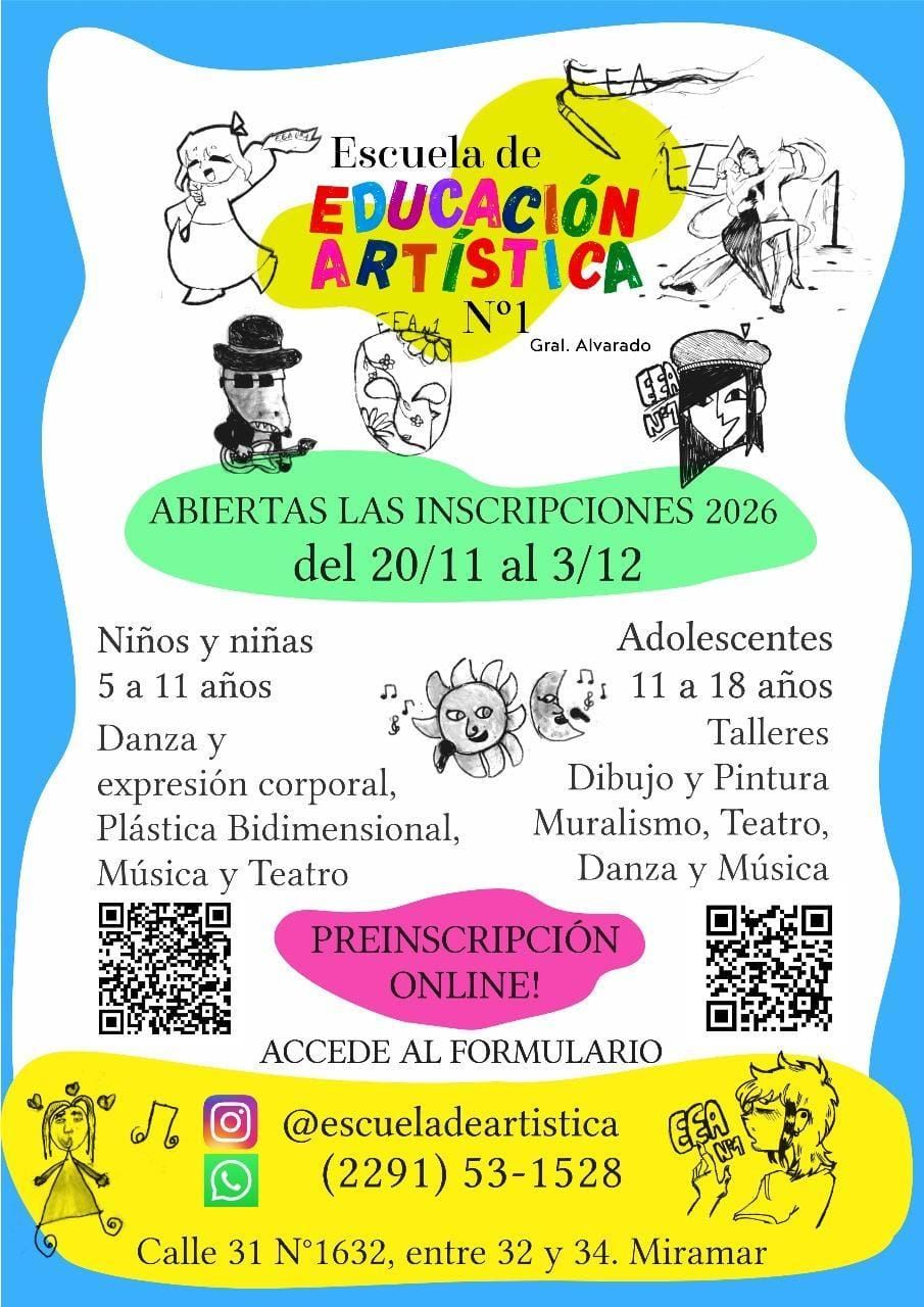 Del 20 de Noviembre y hasta el 03 de Diciembre 2025 está abierta la inscripción a la Escuela de Educación Artística N°1 de General Alvarado, completando el formulario para la PREINSCRIPCION ONLINE.