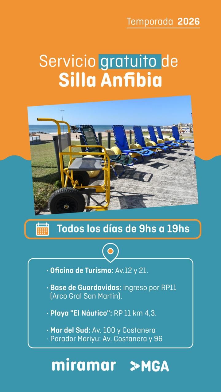 Este verano 2026, disfrutá del mar con el servicio gratuito de Silla Anfibia, disponible todos los días de 09.00 a 19.00 hs para facilitar el acceso a la playa