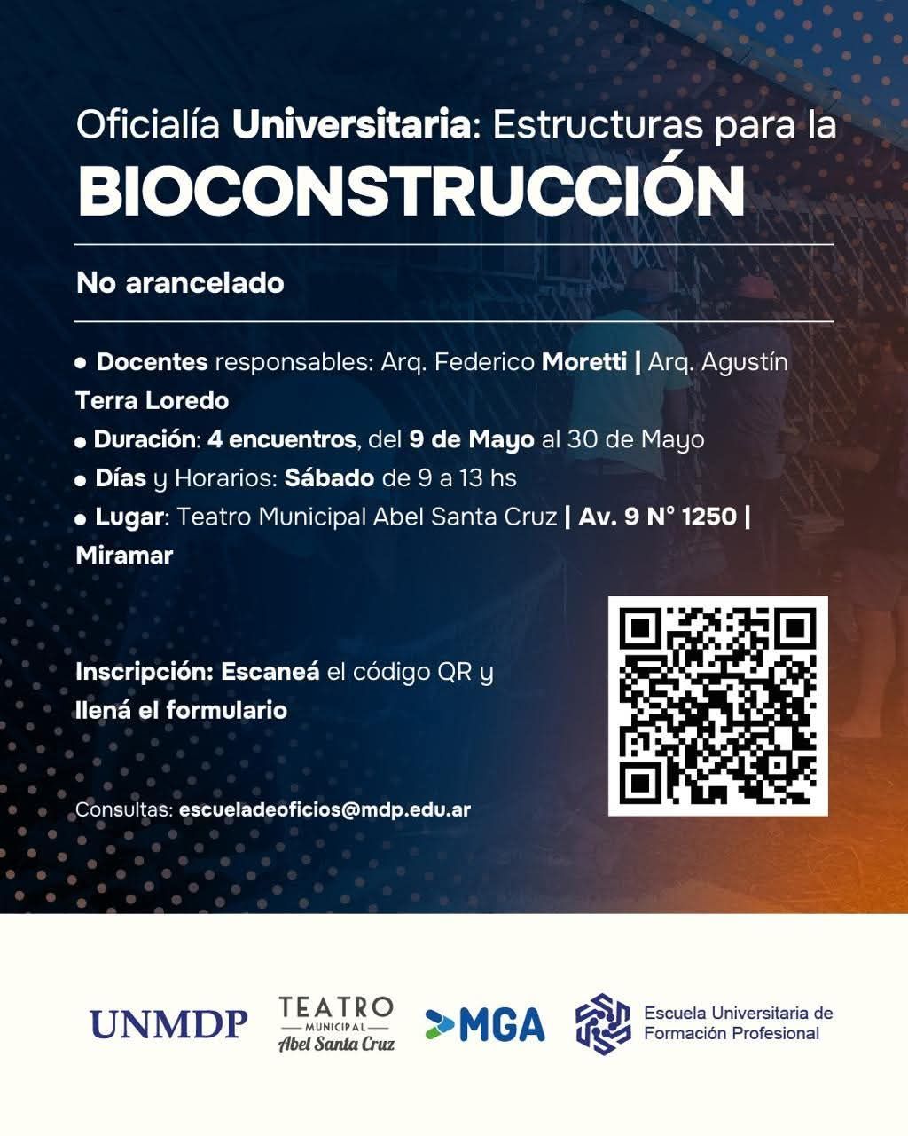 A partir del sábado 9 de Mayo, se inicia un nuevo Curso de Estructuras para la Bioconstrucción, dictado por docentes de la Facultad de Arquitectura, Urbanismo y Diseño de la Universidad Nacional de Mar del Plata en el Teatro Municipal “Abel Santa Cruz” (Av. 9 Nº 1250). No se necesita acreditación de conocimientos previos.