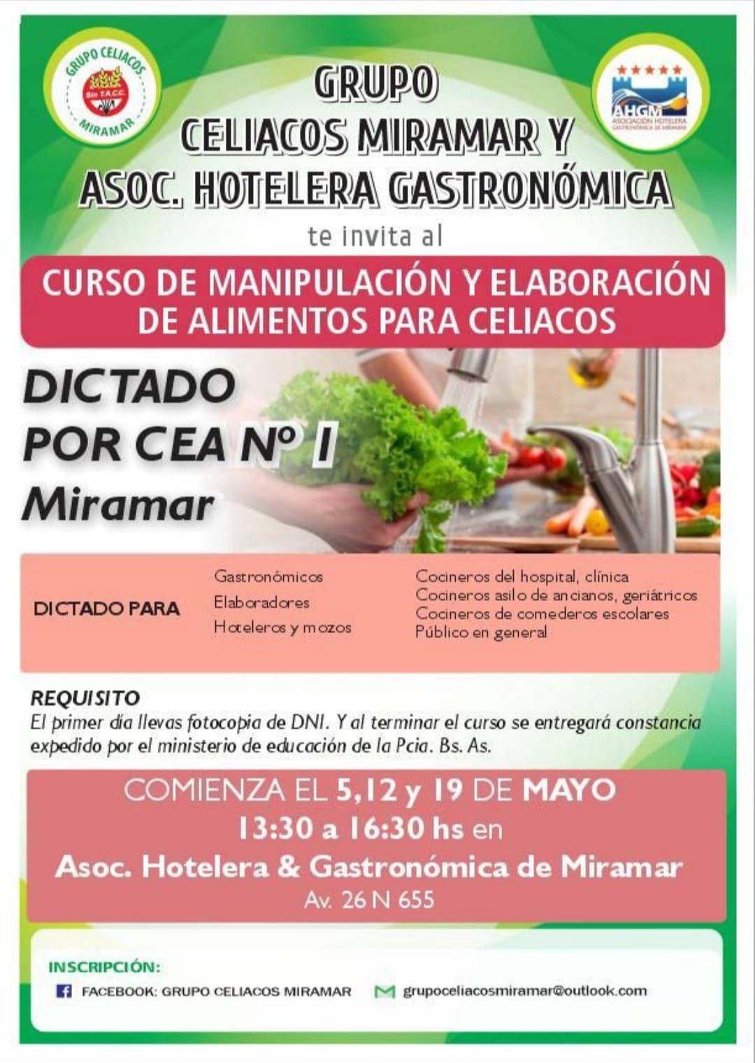 El Grupo Celíacos Miramar y la Asociación Hotelera Gastronómica invitan a participar de esta capacitación, orientada a gastronómicos, elaboradores, hoteleros, personal de salud, comedores y público en general.