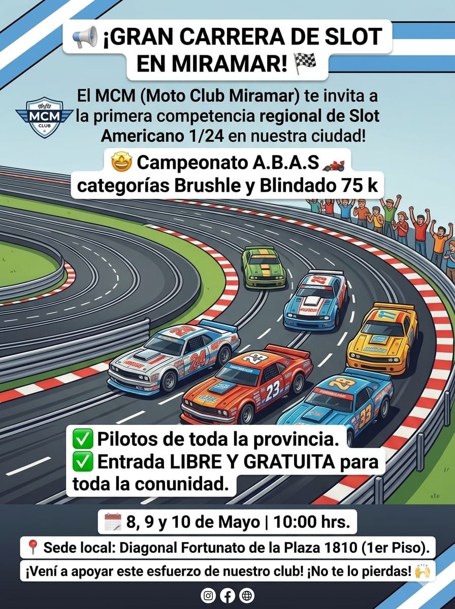 El Moto Club Miramar (MCM) tiene el orgullo de invitar a toda la comunidad a la 1ª Competencia Regional de Slot Americano 1/24.